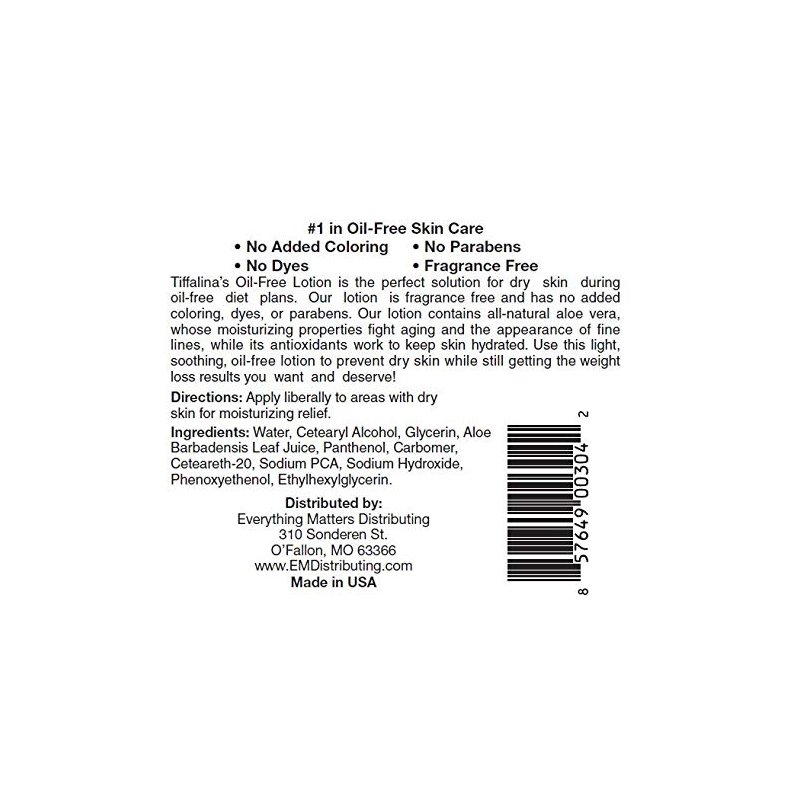 Have you seen NEW and IMPROVED Tiffalina’s Oil-Free Lotion! This product has been recently reformulated to be thicker and creamier. Tiffalina's brand of oil-free lotion is a great oil-free skin care product used by many dieters everywhere. Tiffalina's Oil-Free Lotion is your perfect solution for dry skin while dieting. It moisturizes your skin with no oils and no fat soluble items which (if included) could completely sabotage your amazing weight loss results. This lightweight and airy oil-free lotion is the best of both worlds, dry skin prevention and unhindered weight loss while dieting. Who could ask for anything more?