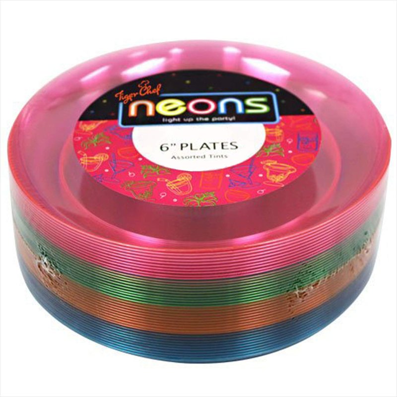 - - GREAT FAMILY - PARTY PACK: Service for 20; party pack includes (20) 6-inch neon plates, (20) 5 oz. plastic champagne glasses, (24) orange napkins, (24) hot pink napkins, (24) lime green napkins, (24) island blue napkins