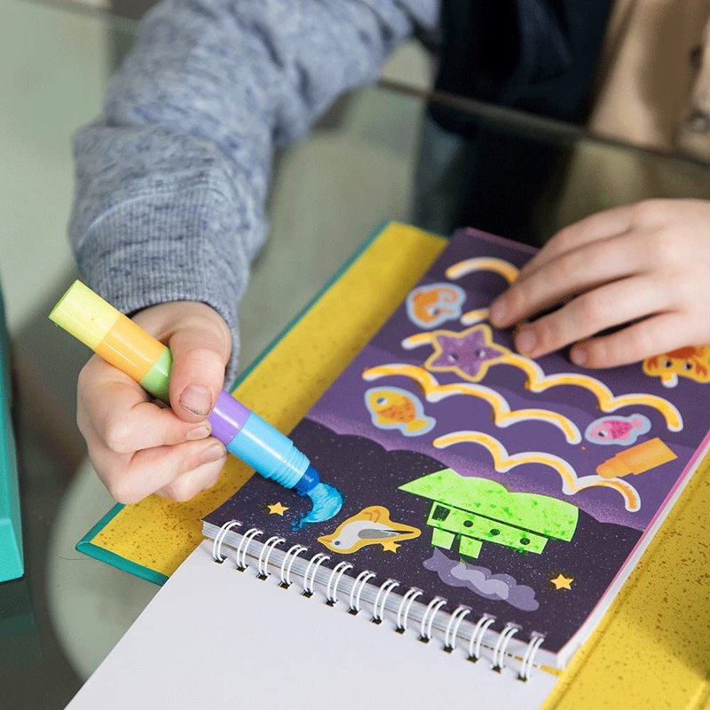 - Contains a special 6 color, stackable (twist off) gel crayon with a cap, 36 page prineted activity book and 5 sheets of ocean themed stickers
