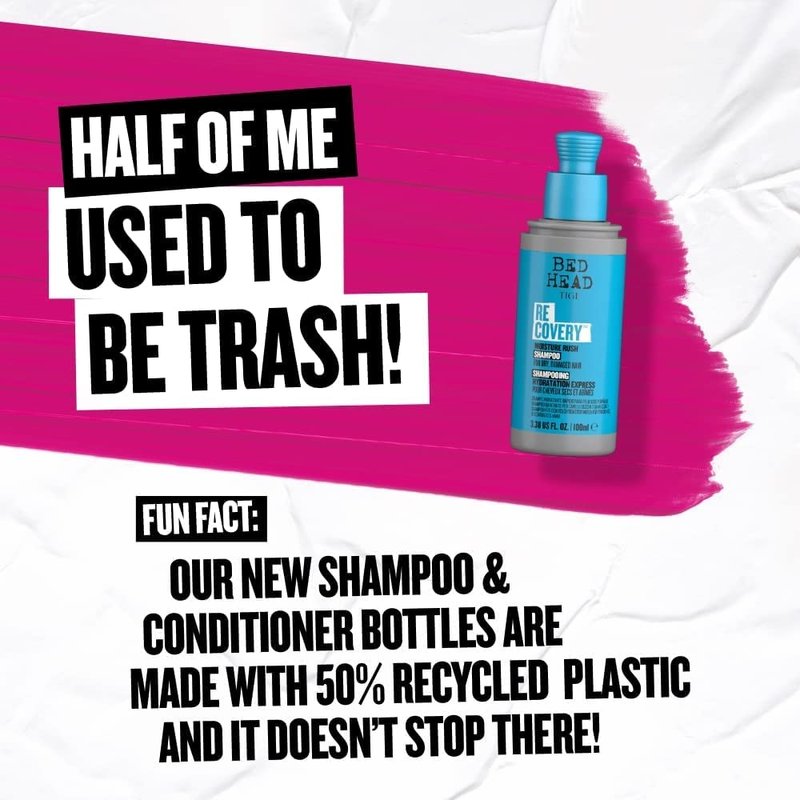 - Bed Head's new Recovery Shampoo with a rich moisturizing formulation; new on the outside and just as epic on the inside; Professional moisturizing shampoo for dry damaged hair; Hydrating shampoo moisturizes, softens and protects hair from future damage; Leaves hair smooth, shiny, soft and looking healthy; The 3.38 fl oz travel size is perfect for holidays, travelling and keeping in your bag for emergencies
