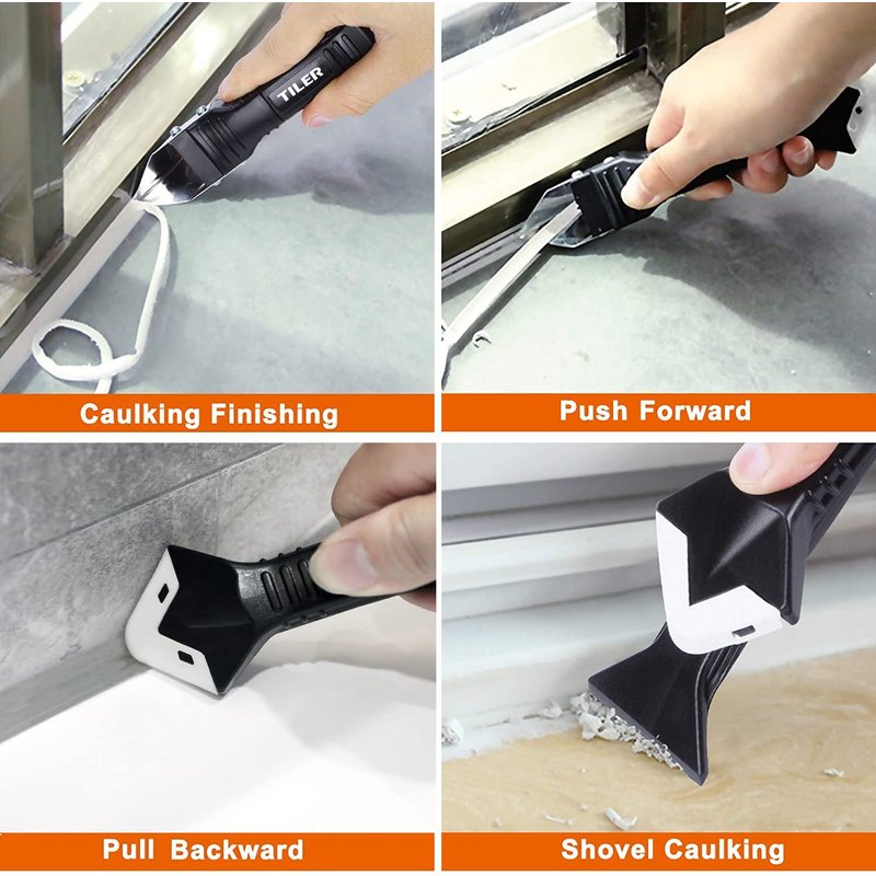 - 👍PERFECT SILICONE CAULKING TOOL: TILER 5-in-1 Silicone Caulking Tool remove the seal and re-sealing and clean the residual glue quickly, and repair the gap effectively. It improves the agglutinating quality and promises an aesthetic sense of the surface.