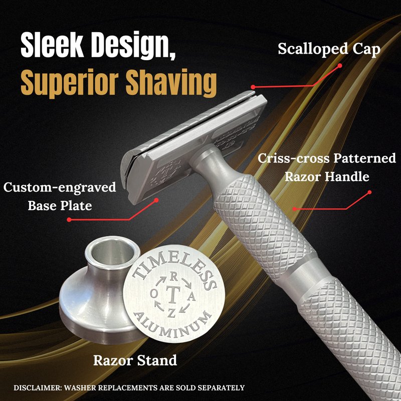 - INCLUDES - Double edge safety razor head with a scalloped cap, a head base plate with .45mm blade gap with CNC machined Timeless Razor Logo, a razor handle & razor stand with laser engraved Timeless Razor Logo. PACKAGING MAY VARY.