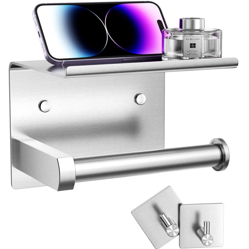 - PREMIUM MATERIAL: Toilet paper roll holder storage with phone shelf + 2 pcs adhesive towel hooks are made by premium grade SUS 304 stainless steel, thickness 1.5 mm (1/16"), ensuring its durability and dependability. Never rust under any circumstance.