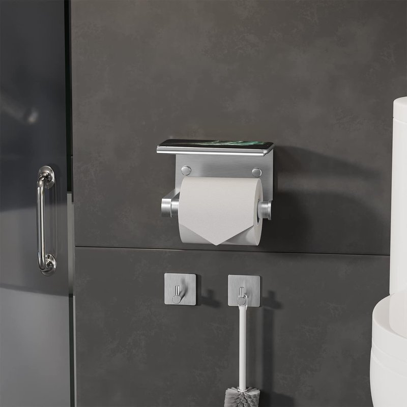 - EASY INSTALL OPTIONS: Our brushed nickel toilet paper holder with phone stand provides you 2 installation option. 1. Just peel off film of self-adhesive pad and stick it on the wall without drilling. 2. Also, it comes with a complete hardware kit for you to mount it regularly. it's very easy even you don't have any DIY experience.