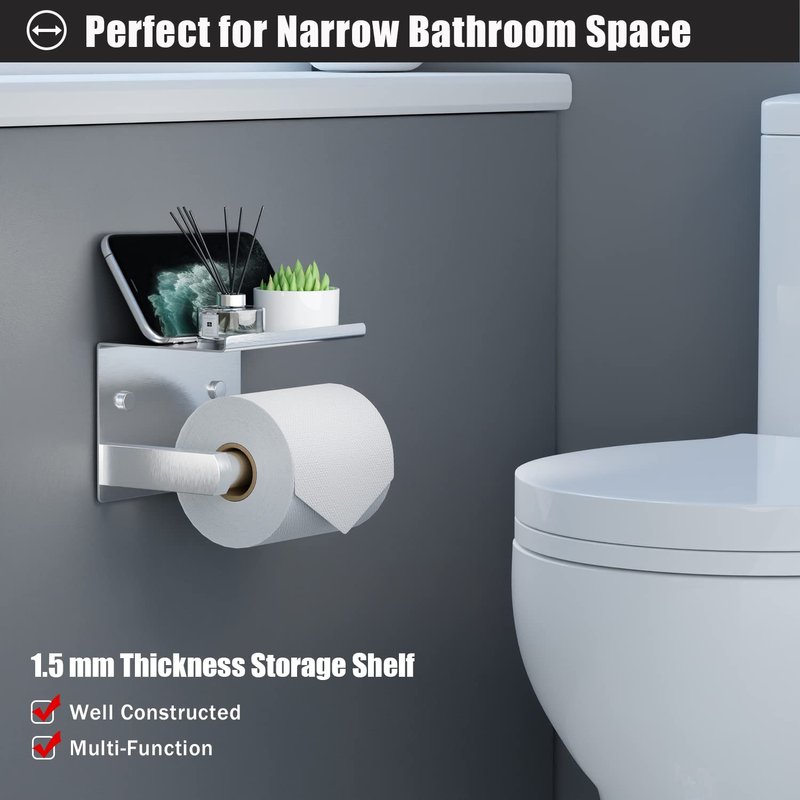 - MODERN & STYLISH DESIGN: Brushed nickel finished, waterproof, rust-proof and corrosion resistant, bathroom paper roll holder with shelf fits a variety of home decor style, add modern home atmosphere and save your efforts from organizing bathroom and kitchen. Standard process builds delicate finish that is beautiful and long lasting.