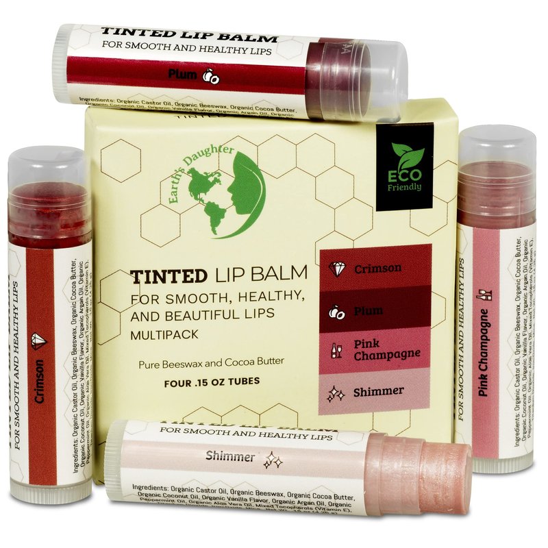 Earth’s Daughter tinted lip balms with organic ingredients provide a splash of color along with 8 hours of moisture and hydration. Our 4 pack includes shimmer which adds a touch of gloss, pink champagne for just a touch of pink, plum, for a slightly richer shade, and crimson for a deeper shade of red.