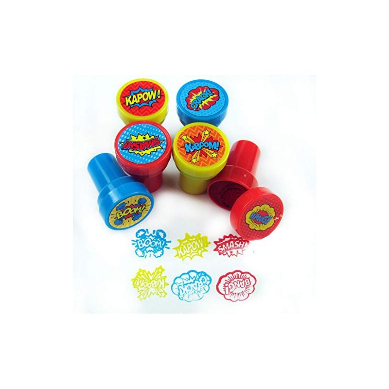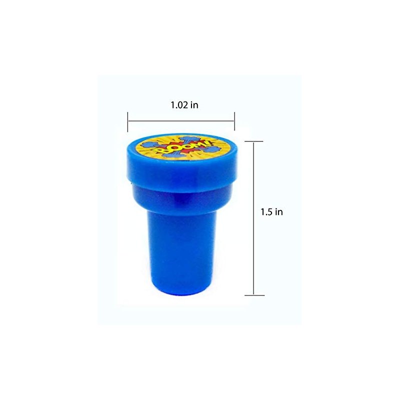 Kaboom! Pow! Smash! Put these awesome superhero word bubbles in your party favor bags! These stampers are also great for school projects, chore charts, creating your party invitations, scrapbooking and decorating stationery. Have this stamp assortment in your party favors bags or the crafts table at your party, for home, in the classroom, or in art class! Our stamps are non-toxic, lead-free have passed all CPSIA and ASTM testing. Safe for children to use. 1.5 inches tall, 1 inch in diameter