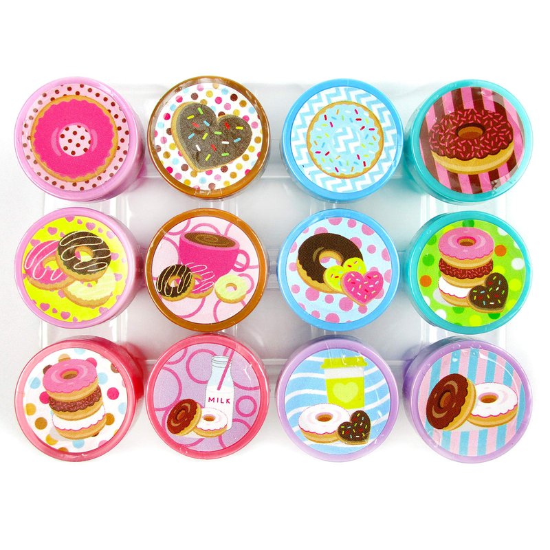 Foodie rejoice! This 12 pcs donut stampers assortment is here to remind you to relax and have a coffee break! These colorful stampers will make a perfect addition to any invitations for your party. Comes with 12 different designs, containing different kinds of donuts, coffee, and the combination of donuts and coffee. These stampers come in a cute plastic reusable box. Have this stamp assortment at home, in the classroom, and even in art class! Our stamps are non-toxic, lead-free, have passed all CPSIA and ASTM testing. Safe for children to use. 1.5 inches tall, 1 inch in diameter.
