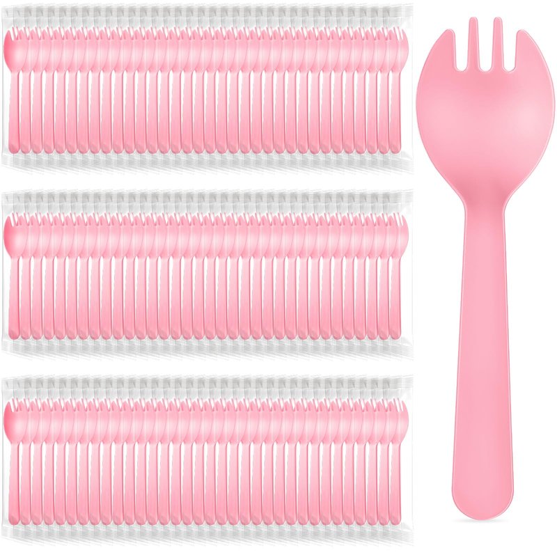 Features: You can also send these individually wrapped forks to your mother, good friend, neighbor and someone who is going to hold a party or set up a shop. These disposable serving utensils are simple to store and carry, saving your space. The 2 in 1 spoon and fork design is practical for most food. Specifications: Material: plastic Color: pink Size: about 4.5 x 1.26 inches/ 11.5 x 3.2 cm Total: 150 pieces Package includes: 150 x Plastic sporks Notes: Manual measurement, please allow slight errors on size. The color may exist a slight difference due to different screen displays.