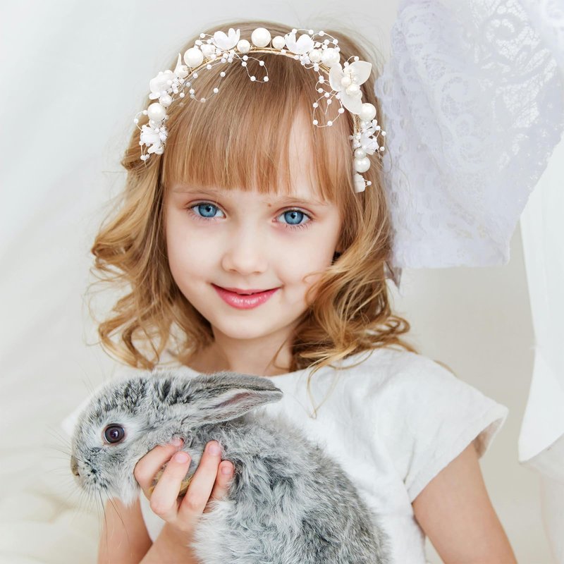TIOSRU Flower Girl Headpiece, Pearl Headband for Girls Gold Flower Girl Hair Accessory Wedding Headpiece for Bride Alloy Floral Bridal Headband Wedding Prom Photography for Girls and Women