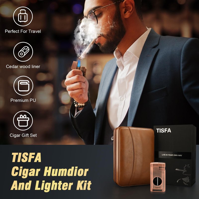 TISFA Cigar Humidor, Leather Cedar Wood Cigar Case with Cigar Lighter, V Cut Cigar Cutter, Cigar Holder 3 in 1, Portable Travel Cigar Humidor Box with Humidifier (Brown)