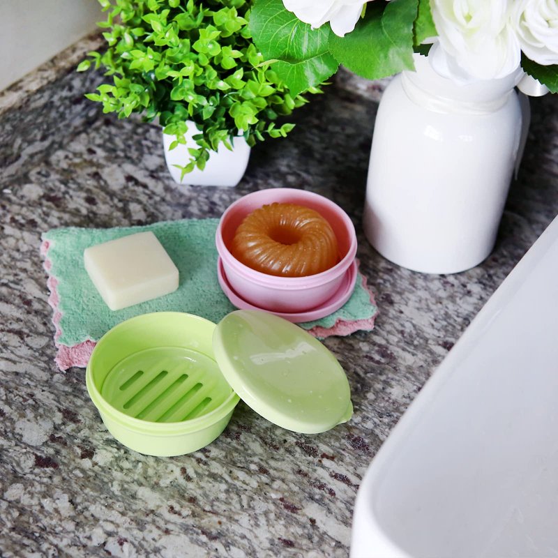TITATI Plastic Soap Container, Soap Bar Holder Travel Case Portable Round Soap Dishes with Lid Leak-Proof Soap Box for Shampoo Bar (Pink & Green)