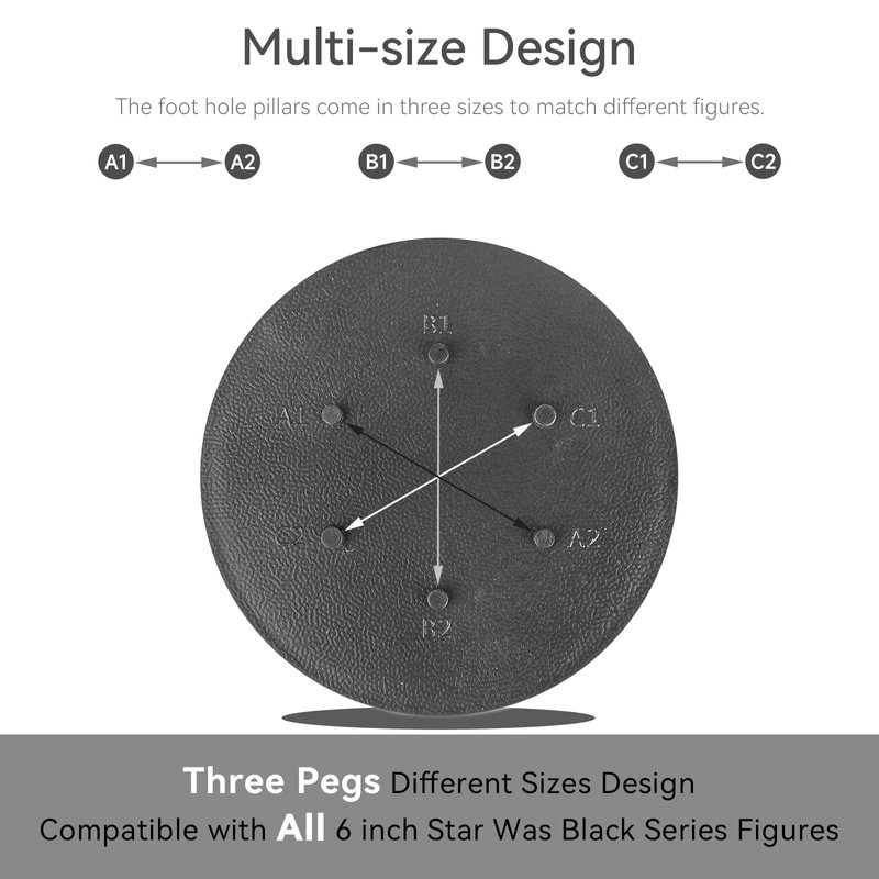 - ATTENTION TO SIZE: The diameter of each figure display stand is 75 mm / 2.95 inch. It is available in multiple nail sizes, namely peg A1 matching peg A2: 3.0mm/ 0.12inch; peg B1 matching peg B2: 3.25mm/ 0.13inch; peg C1 matching peg C2: 3.6mm/ 0.14inch. Fit for Most 6 inch Star Was Black Series action figure Toy. Please confirm the size before buying, otherwise it will not be the right size for your action figure..
