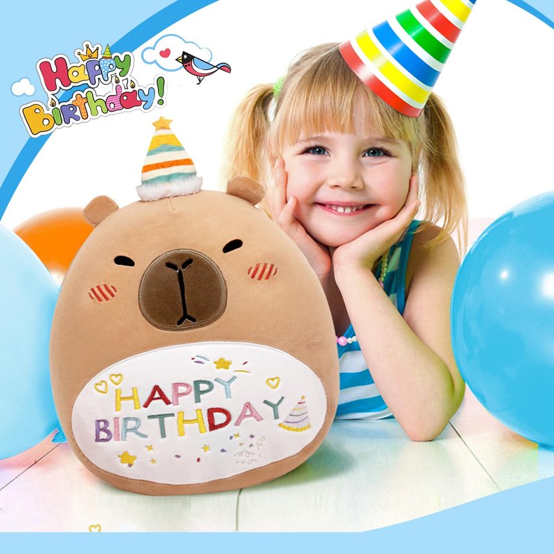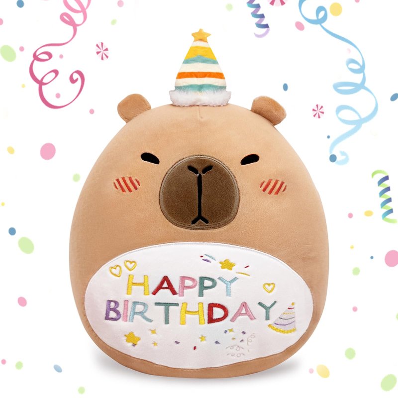 - Birthday Capybara Plush-Kawaii capibara stuffed aniamls is designed based on the capybara. Cute capybara plush uses birthday elements to show the cuteness of the capybara. The birthday hat on the head is extremely cute, the powder blusher on the face is more vivid, and the happy birthday on the belly adds to the festival atmosphere