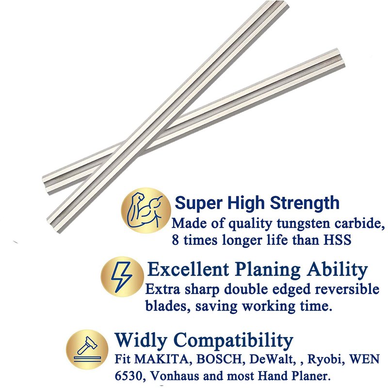 - The planer blades made of K10 fine grade tungsten carbide, increased 50% harder than competitive carbide blades for longer cutting life and improved performance.