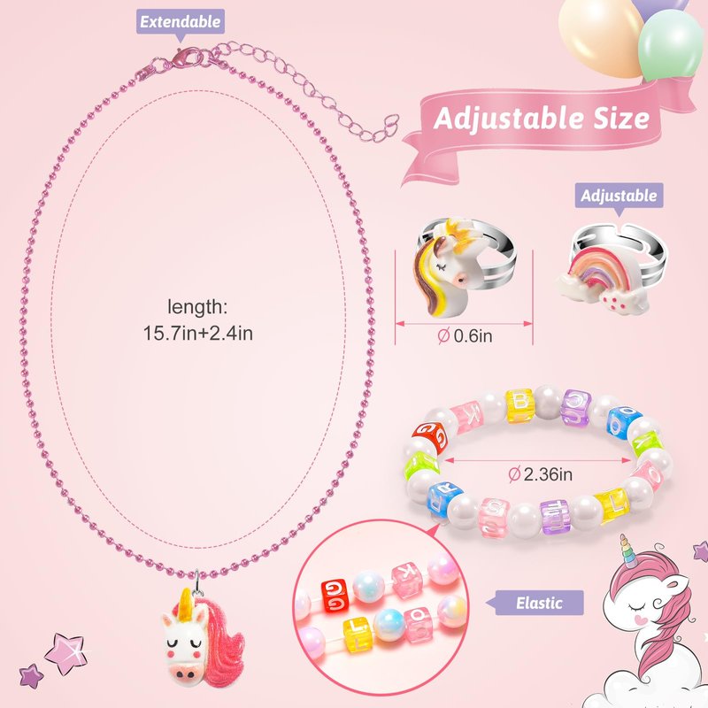 - ADJUSTABLE FIT: Necklaces come with lobster clasps for adjustable length, bracelets are elastic for easy wearing, and rings feature adjustable sizing, making it suitable for toddlers and little girls ages 3-5 8-10