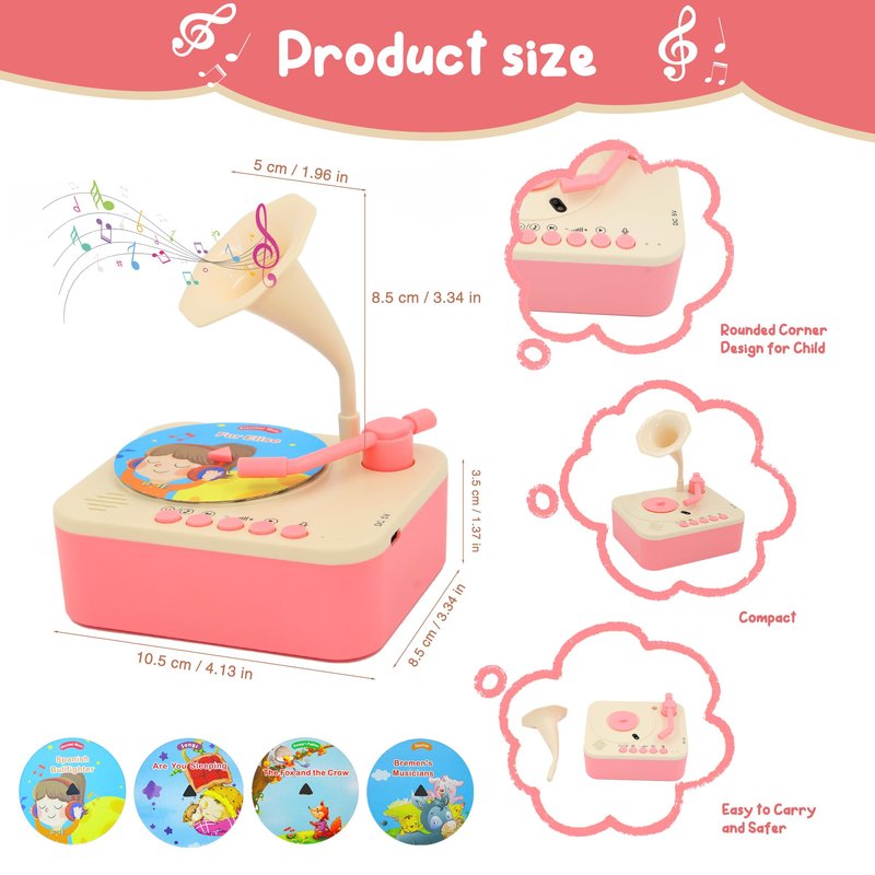 - šInteractive Toddler phonograph with 96 Records: This kids gramophone includes 96 cards featuring stories, aesop's fables, songs and classical music to engage your childās imagination and enhance cognitive, language, and musical skills. It's the perfect early education companion for kids aged 3 and older