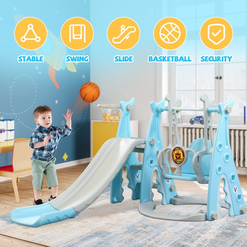 - 【Multi-functional Kids Playset】 The 4-in-1 playing set offers 4 games: a smooth slide, a non-slip climber, a sturdy swing and a basketball hoop, which is intended for family and domestic outdoor use. All activity elements are appropriately sized for toddlers 3+ years old.