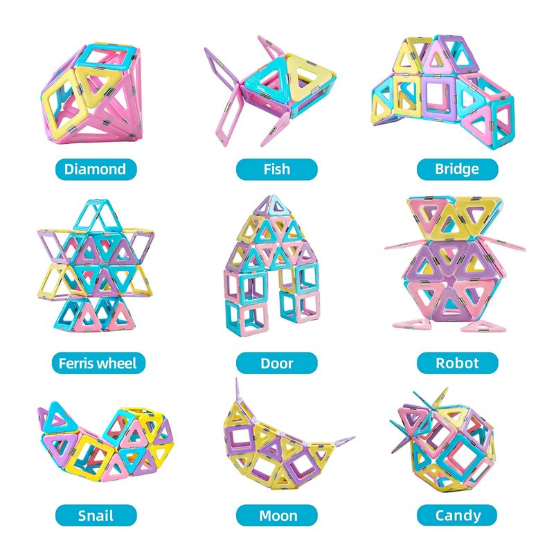 - 🌈Creative 3D Building Toys: Children can build various geometric structures with different magnetic shape tiles, like buildings, robots, animals, plane and anything else kid can imagine up, Through build creative shapes to improve kid's imagination, eye-hand coordination and color & shape recognition.