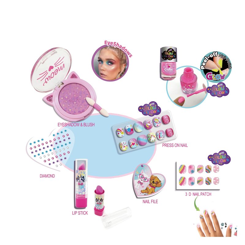 - Variety Pack: The set includes 1 eyeshadow&blush, 1 bottle of nail polish, 1 lip stick, 1 sheet of gem sticker, 1 nail file, 12 press on nails and 10 nail patches for endless makeup experimentation.