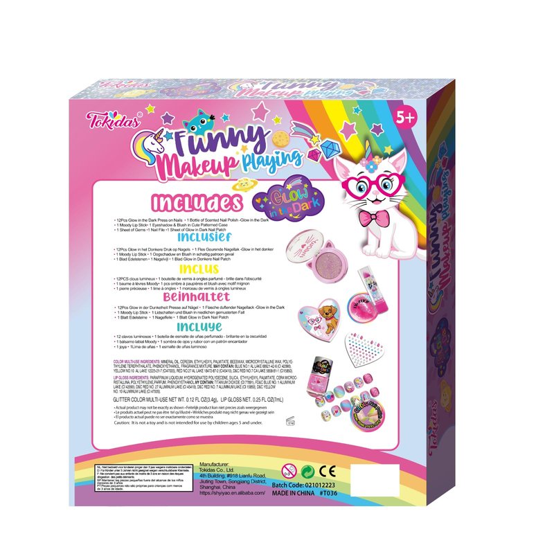 Unleash your creativity with this Tokidas Funny Makeup Playing set! Designed for kids aged 5 and up, this set is the ultimate playground for budding makeup artists. With glow-in-the-dark and scented nail polishes and press-on nails, eyeshadow and blush, your little ones can explore the vibrant world of makeup safely. The set includes a cute unicorn figurine, adding a touch of whimsy to the experience. Let their imaginations run wild as they experiment with different colors and textures. This makeup set is a perfect gift for birthdays or any occasion, providing hours of fun and creative expression. Please note that it contains small parts, so adult supervision is recommended for children under 3 years old.