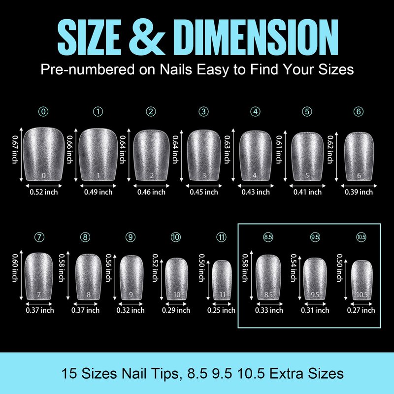 - 【15 Sizes, 450Pcs】Extra short nail tip has 15 sizes of nail tips totaling 450 pieces. In addition to the common 12 sizes, we have added 3 additional sizes so you can find the best size nail tips. The gel nail tips are marked with numbers at the top to help you find the suitable tips more easily.