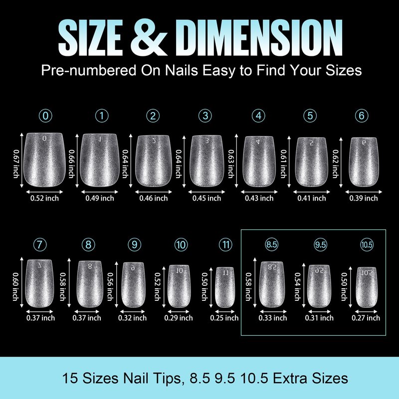 - 15 SIZES, 360PCS: Extra short nail tip has 15 sizes of nail tips totaling 360 pieces. In addition to the common 12 sizes, we have added 3 additional sizes so you can find the best size nail tips. The gel nail tips are marked with numbers at the top to help you find the suitable tips more easily.