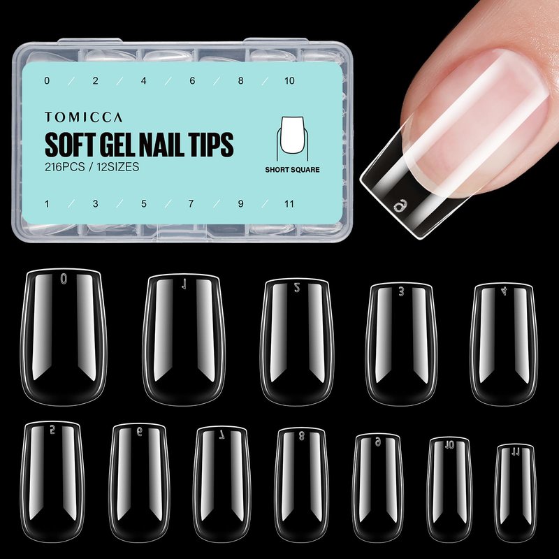 TOMICCA Fake Clear Nails, Short Square False Nail Tips, 216Pcs Nail Extension Tips for DIY Salon Gift