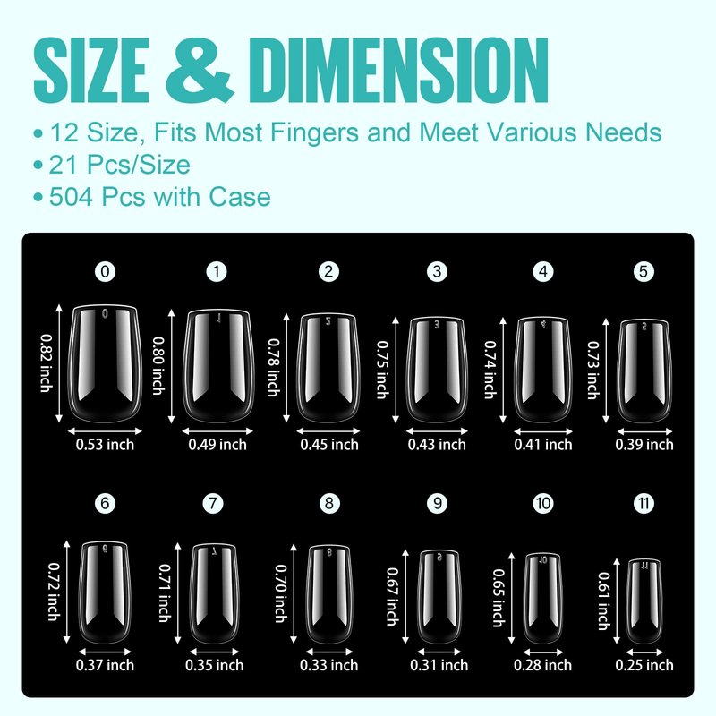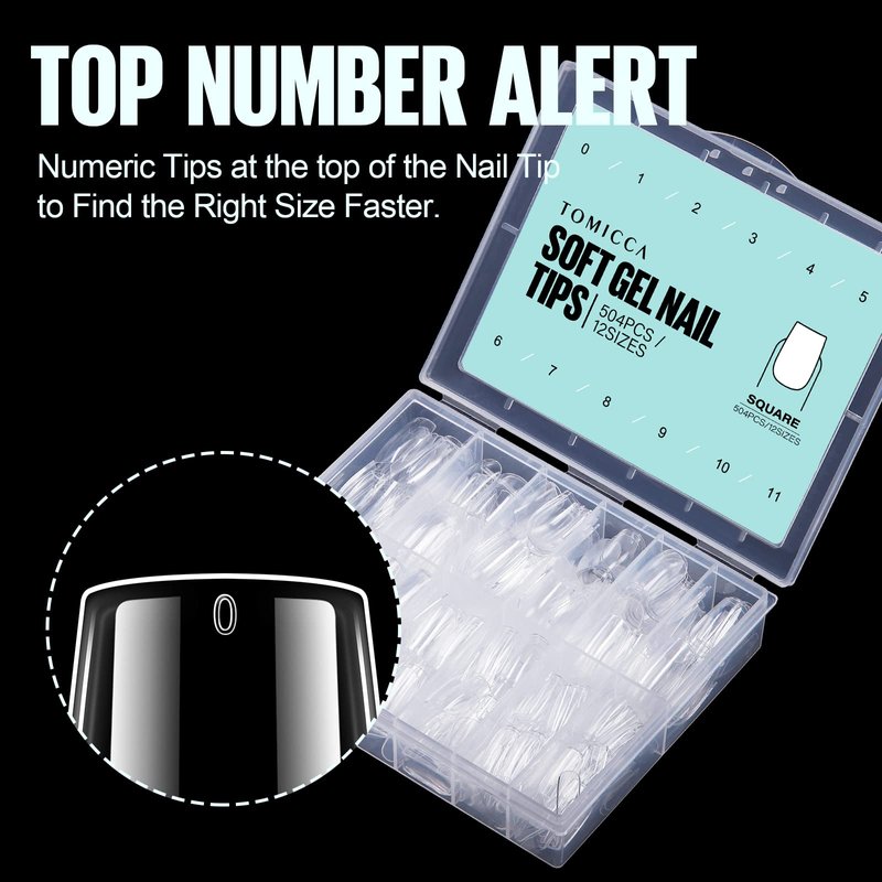 - MULTIPLE SIZES AND NAIL TYPES: TOMICCA offers 504Pcs of artificial nail tips in 12 different sizes. Suitable for most finger needs. Each false nail tip is individually numbered, so you're sure to find a full nail tips that fits your natural nails.