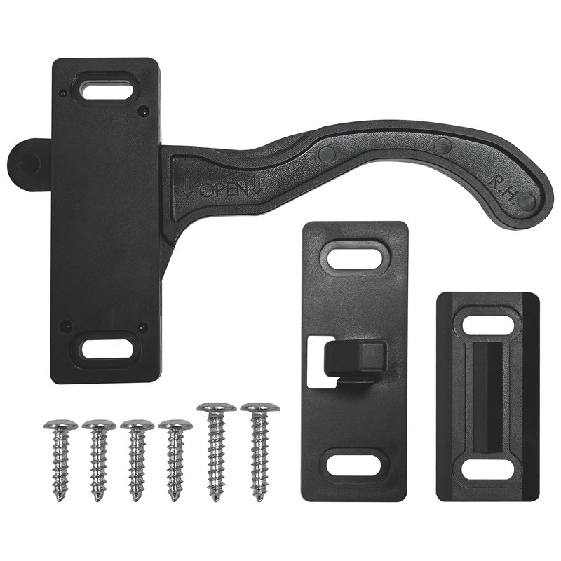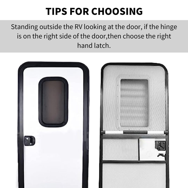 - RIGHT-HANDED LATCH: Determine if your door is right or left-handed by standing outside the RV and looking at the door. If the hinge is on the right, our right-handed latch will work for you.