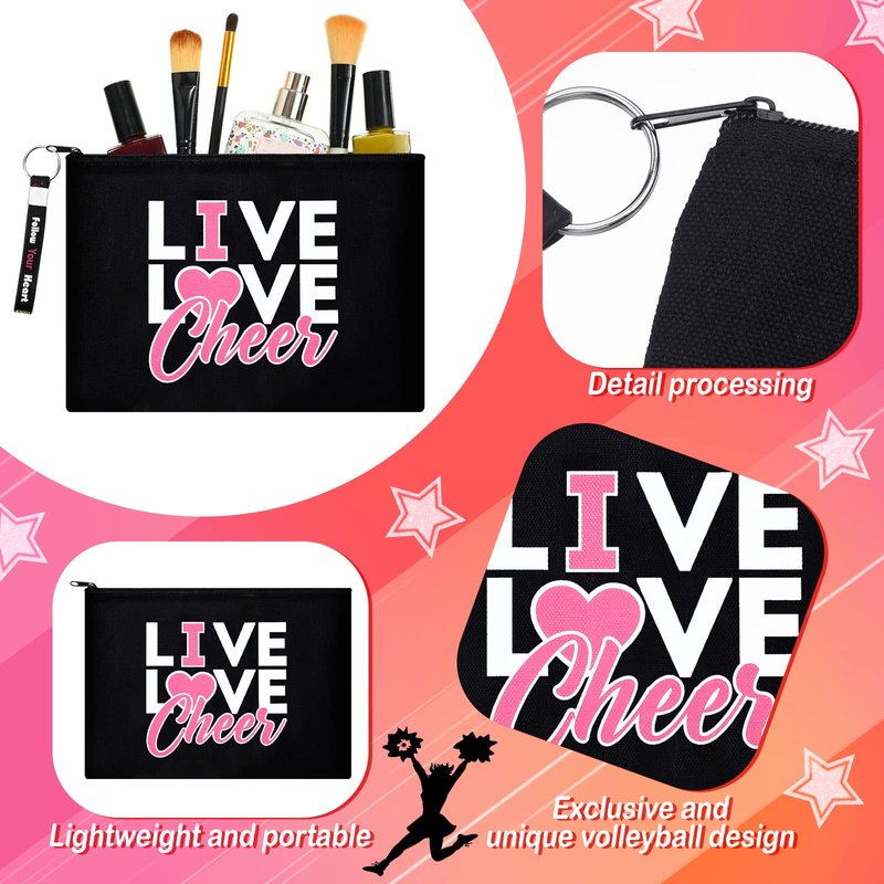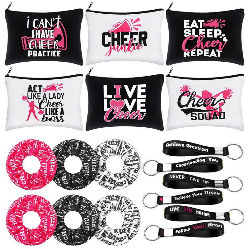Tondiamo 18 Pcs Cheerleading Makeup Bags Cheer Bags Cases Zipper Pouch Cheerleading Quote Keychain Inspirational Key Ring Cheer Scrunchies Girls Elastic Hair Accessories for Cheerleader Teammate Gift