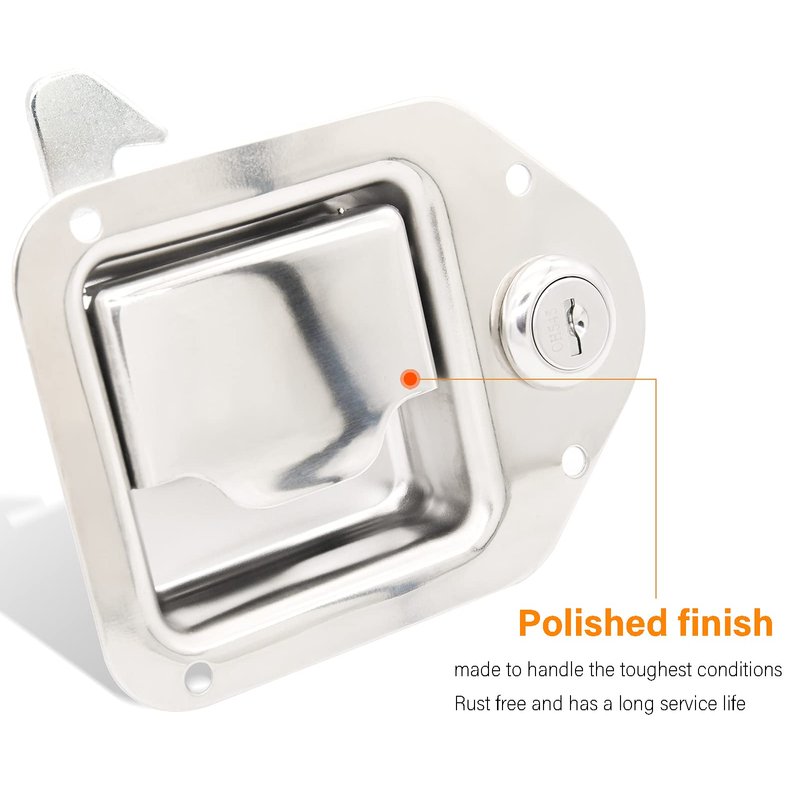 Truck tool box latch Constructed of Heavy Duty Rust-Resistant Stainless Steel with a polished finish; made to handle the toughest conditions,Rust free and has a long service life. Lock cylinder has shuttered keyway to keep dust and dirt out.