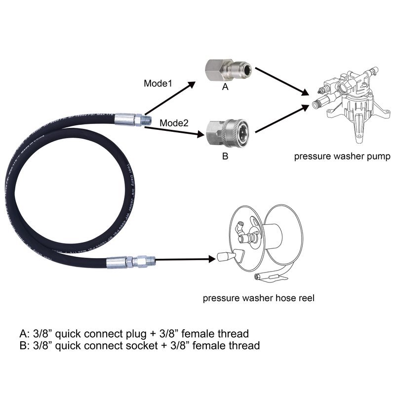 - Package include: 1 piece pressure washer jumper hose ( 4 FT ), 1 piece 3/8” quick connect plug + 3/8”female thread adapter; 1piece 3/8” quick connect socket + 3/8” female thread adapter.