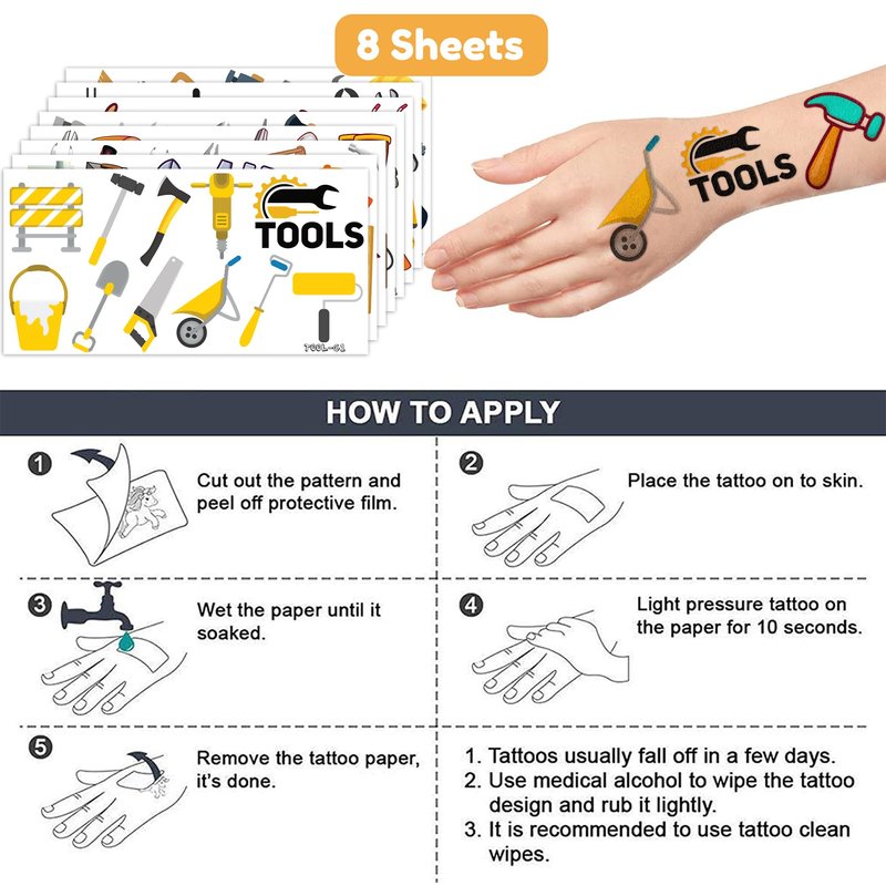 - Style: Tools Temporary Tattoos Sticker; Birthday Party Supplies; Birthday Decorations; Party Favors;