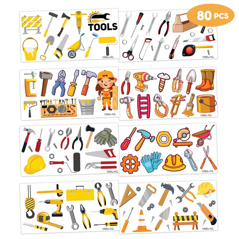 - 🔧【PERFECT TATTOOS FOR THEMED TOOLS, HANDYMAN】: Tools temporary tattoos from our popular collection will meet children's expectations, as they eagerly anticipate having them at Birthday parties, special celebrations. Each set includes 8 sheets with a total of 80 Pcs. The size of each tattoo sticker is 6.1 * 3.1 inches, suitable for both adults and kids. The assortment of construction-themed tattoos, designed in various styles, promises to enhance the lively atmosphere for parties.