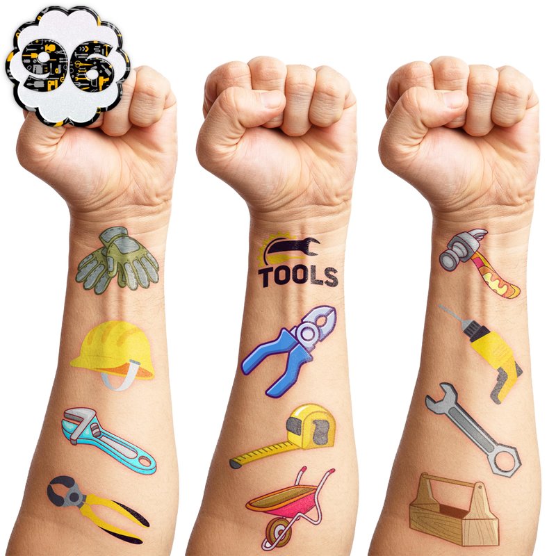 - 🎉【GREAT GIFT IDEAS FOR TOOLS, HANDYMAN PARTY SUPPLIES DECORATION 】: Tools temporary tattoos provide children with the experience of exciting construction missions. With these tools tattoos from our shop, children can immerse themselves in the role of real builders in a virtual construction scene, complete with equipment and tools. During the party, children will have no boredom at all, replaced with cheer and excitement as they play with our captivating tattoos. One size fits kids.