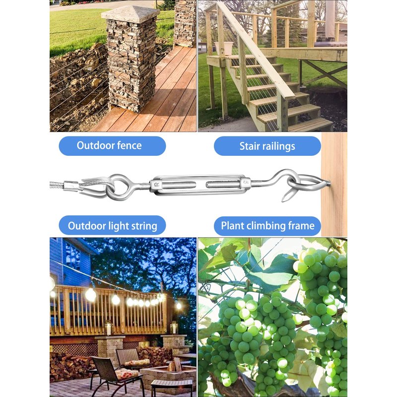 - 【Multipurpose Turnbuckle Kit】: 1/16 Stainless Steel Cable Turnbuckle Kit can get a wide range of light hanging tasks done and allow more flexibility in use including strings light hanging kit outdoor,garden wire kit for climbing plants,wire trellis kit ,espalier wire kit,guy wire kit,wire curtain hanging system,tension wire for chain link fence,cable railing kit,indoor stairs railing, clothesline wire,gate wire tension kit,anti sag gate kit,fence tension wire,catenary wire kit,etc...