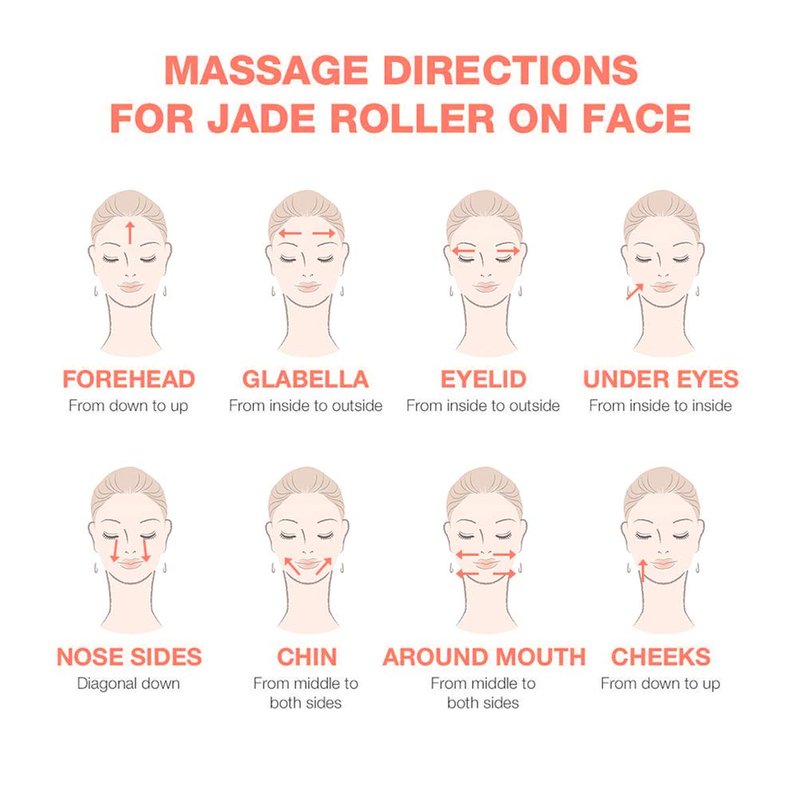 No.3--Use upward motions to move the Jade roller gently over your forehead,cheeks,around the lip area and your neck. Close your eyes and roll gently over your eyelids if you have puffy eyes or bags under your eyes.