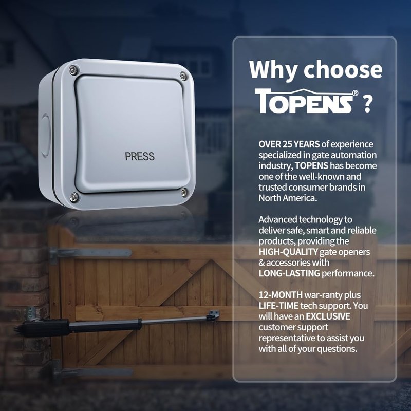 - Clever Design - TOPENS TC148 waterproof wired push button is a release switch designed for outdoor use, and commonly used at locations where the access control is essential. Weatherproof casing ensures the superior protection against water and dust from all directions. With automatic resettable design, the release button restores to its original state after your finger is removed. Simply press the button to start or stop the gate opener!