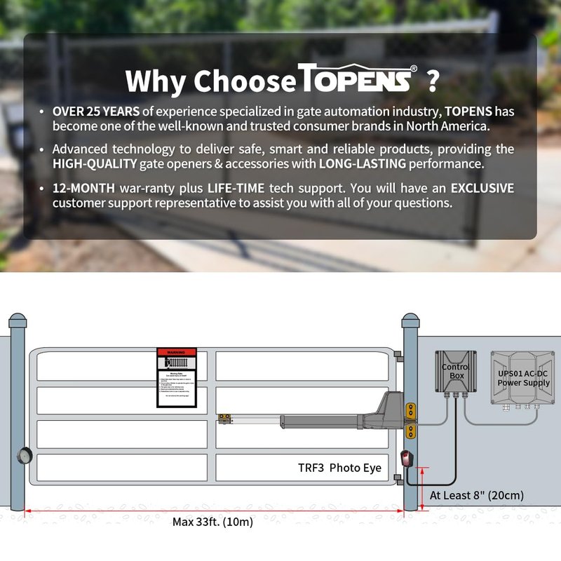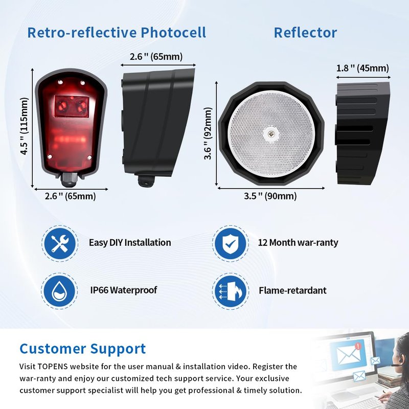 - Reliable Reversing Sensor - TOPENS TRF3 Reflection Photocell Sensor is an outdoor photoelectric sensor with rapid response. It creates a safety barrier that detects any movement in its path. Once triggered, it perfectly makes the gate stop or reverse automatically in case of obstruction. It is strongly recommended to use the TRF3 reflective sensor with automatic gate opener system to ensure multiple protection & security.