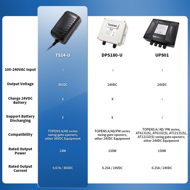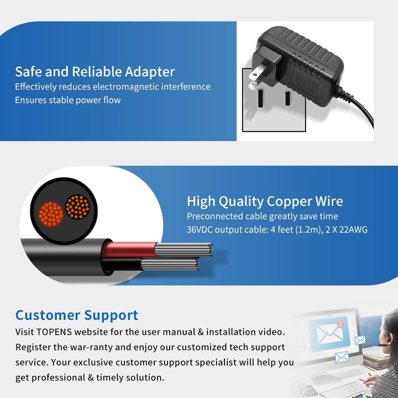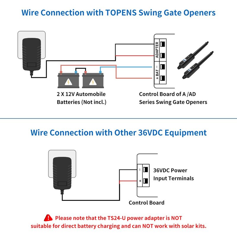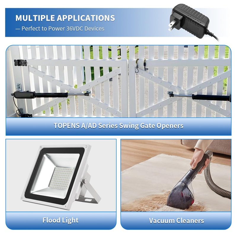 - WIDE APPLATIONS - The TS24-U voltage transformer can directly power 36VDC devices, such as LED strip lights, vacuum cleaners and other DIY tools. In addition, this adapter is ideal for charging 24VDC batteries to power TOPENS A & AD series swing gate openers. It is recommended to use where AC electricity is accessible, but not stable. Simply connect the TS24-U power converter to the control board and plug it into an outlet.