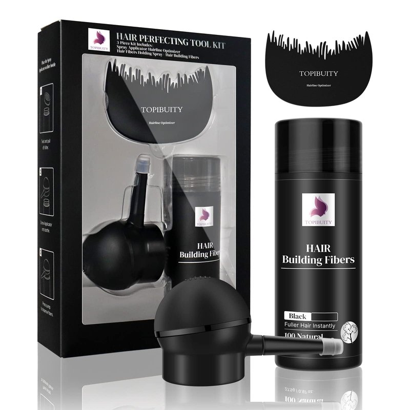 TOPIBUITY Hair Thickening Fibers & Applicator Set - Natural Long-Lasting Concealer for Fuller Hair, Thicker Beard & Crisp Hairlines (BLACK)