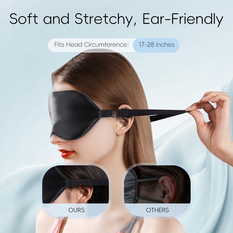 - 𝐀𝐭𝐭𝐞𝐧𝐭𝐢𝐨𝐧 𝐭𝐨 𝐃𝐞𝐭𝐚𝐢𝐥: Our eye mask for sleeping does not exert additional pressure on the ears. On the contrary, it features an adjustable elastic band that secures around the entire head, distributing pressure evenly for comfortable and safe wear.