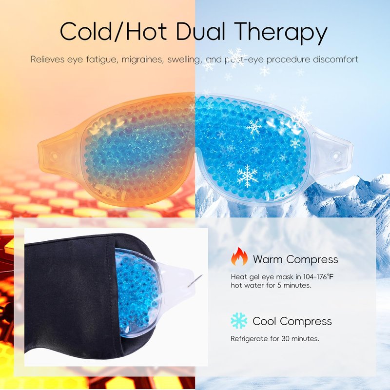 - 𝐆𝐞𝐥 𝐂𝐨𝐥𝐝 𝐚𝐧𝐝 𝐇𝐨𝐭 𝐃𝐮𝐚𝐥 𝐀𝐩𝐩𝐥𝐢𝐜𝐚𝐭𝐢𝐨𝐧: Tailored for dry eyes and headaches, our gel eye mask offers both hot therapy (relieving eye fatigue and dark circles) and cold therapy (alleviating headaches). It's the ideal choice, particularly effective for reducing morning eye puffiness.