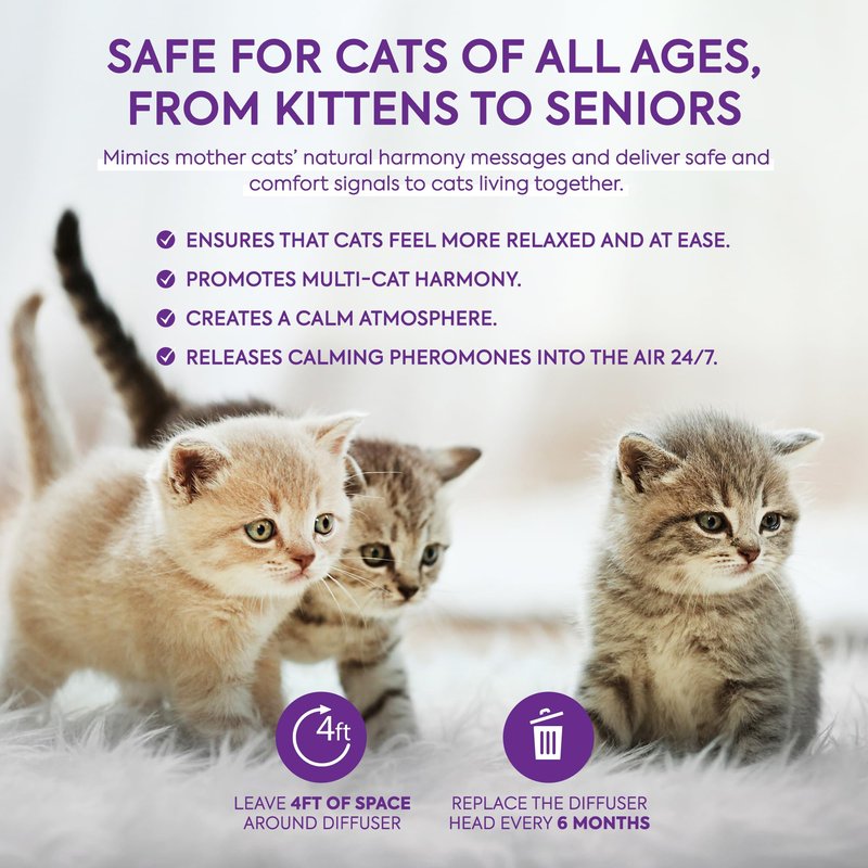 - SAFE FOR CATS OF ALL AGES: TopSum cat pheromone diffuser is suitable for cats of all ages, including kittens and senior cats, promoting a stress-free environment for every feline. Cat calming diffuser is safe for both cats and humans. Replace the cat calming diffuser head every 6 months. Visible reduction in stress-related signs such as excessive grooming, meowing, or restlessness may be observed within 2 weeks use of a cat calming diffuser. It uses natural cat pheromones and all plant based ingredients.