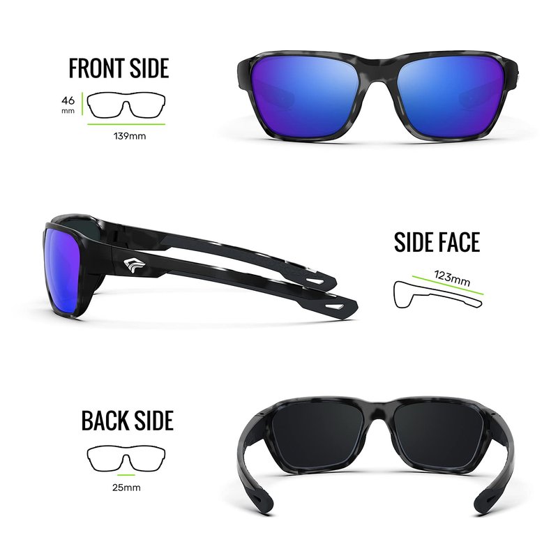- DESCRIPTION & PACK>>> Frame-width is 123mm(4.84n); Bridge-width is 25mm(0.98in); Lens-width is 69mm(2.7in); Temple-lengthis 123mm(4.84n). INBOX have 1x Sunglasses storage case; 1x Gift Box; 1x Microfiber bag; 1x Strap; 1x Instructions; 1x Polarized Test Card.