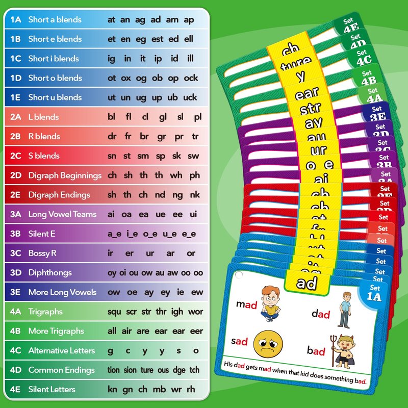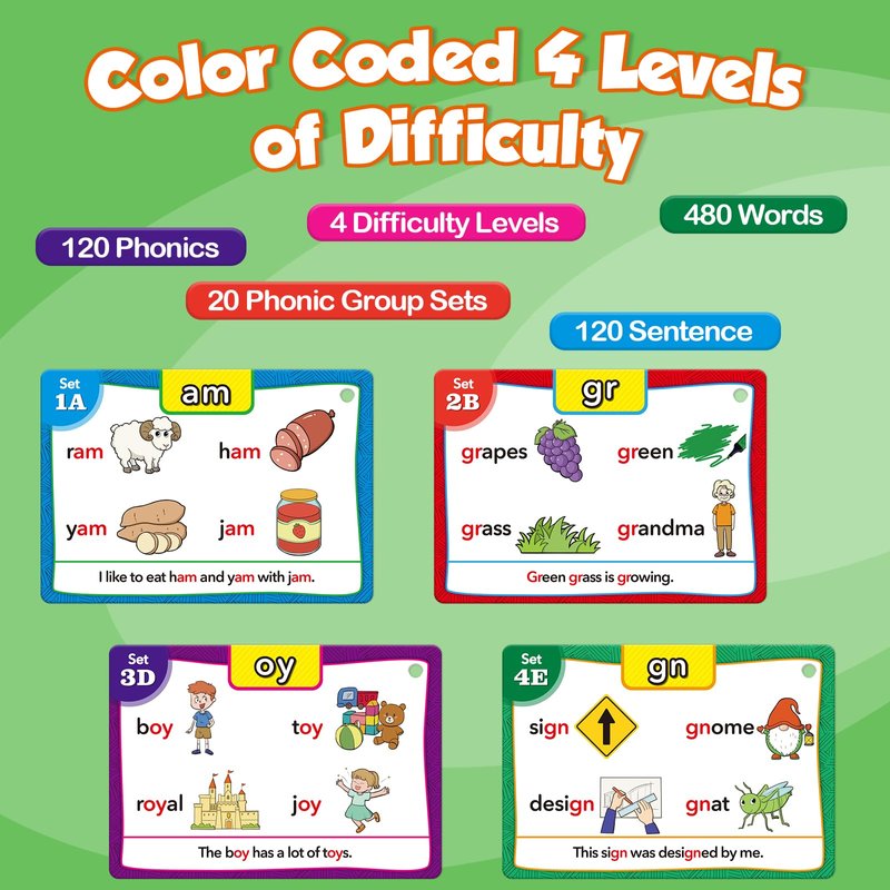 - 【What's Included】Include 62 double-sided phonics flash cards, and 4 colored rings for easy classification. Covering up to 80% of vocabulary found in beginner books, there are a total of 480 words, 120 Phonics, 480 Pictures, 120 Sentences, 20 Phonic Group Sets (1A-5E)