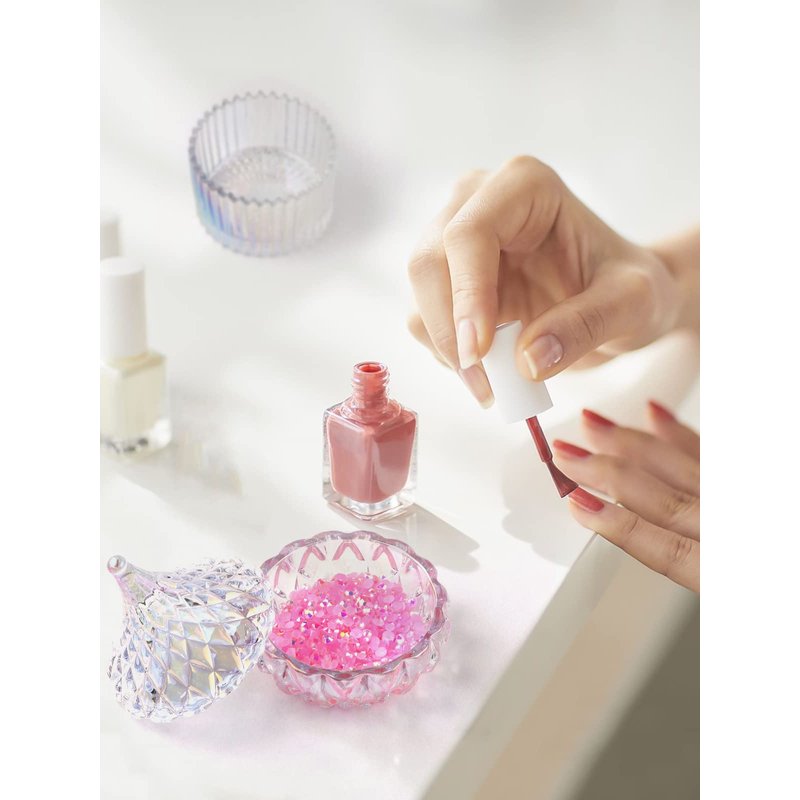 - 【Package Contents】A set of 2 dappen dish for acrylic nails measuring approximately 3.7" x 3.7" x 3.3" and 3" x 3"x 3". Made of high-quality crystal glass,unique retro flow design with colorful luster engraved on its outside, smooth lines, exquisite workmanship, 360° refraction of dazzling light, safe and harmless, and the decorative effect will make your eyes shine