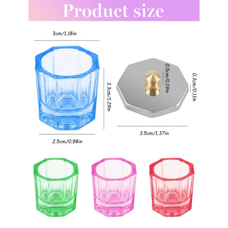 - 【Package Included】You will get 4pcs crystal glass nail art dappen dish in color red, blue, green and pink, each one of them comes with stainless steel lid. Enough quantity to meet your different needs when doing nail design, and the different color also can help distinguish the different product inside.