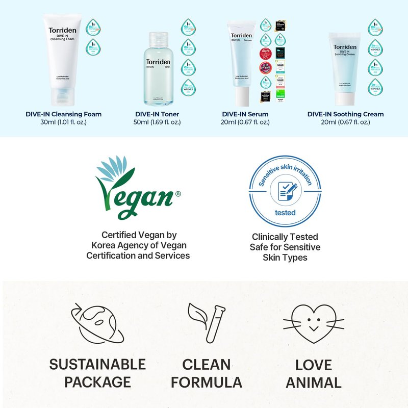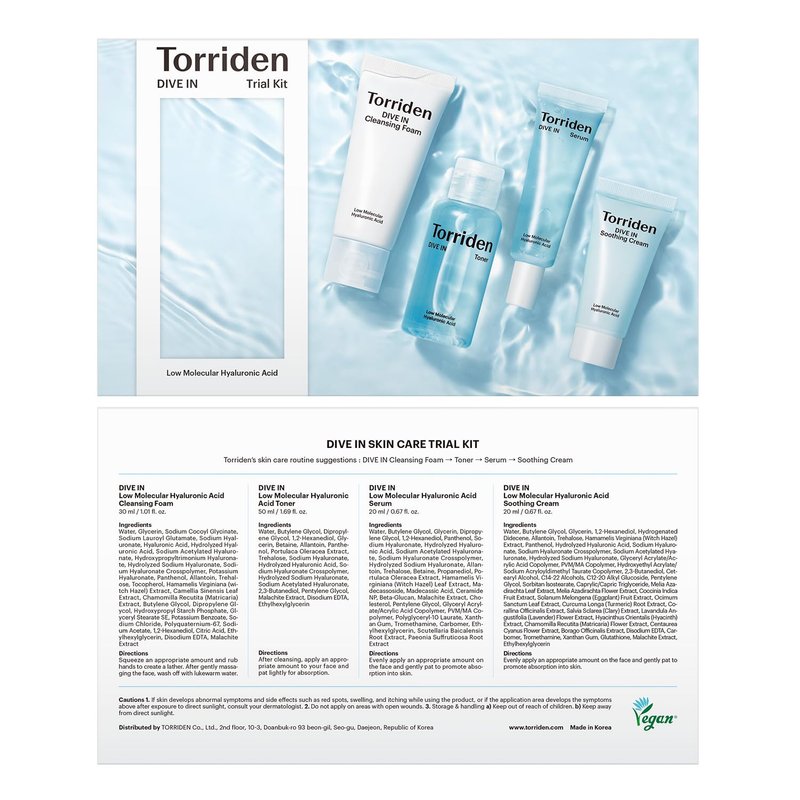 Torriden DIVE-IN Trial Kit, Hyaluronic Acid Infused Daily Skincare Kit - 4 Step Regimen with Foam Cleanser, Facial Toner, Serum, and Cream | Vegan, Hypoallergenic Korean Skin Care